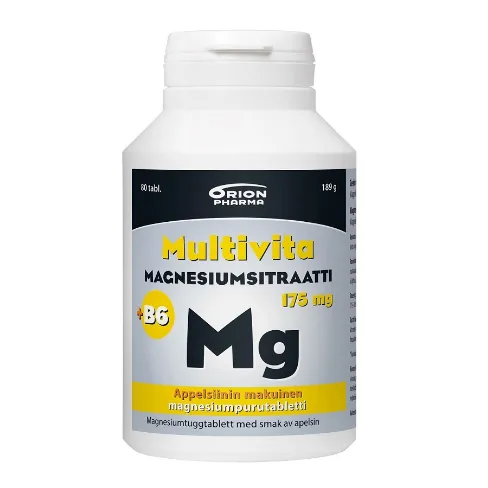 Multivita Magnesiumsitraatti +B6 - это высокоусваиваемый цитрат магния со вкусом апельсина.