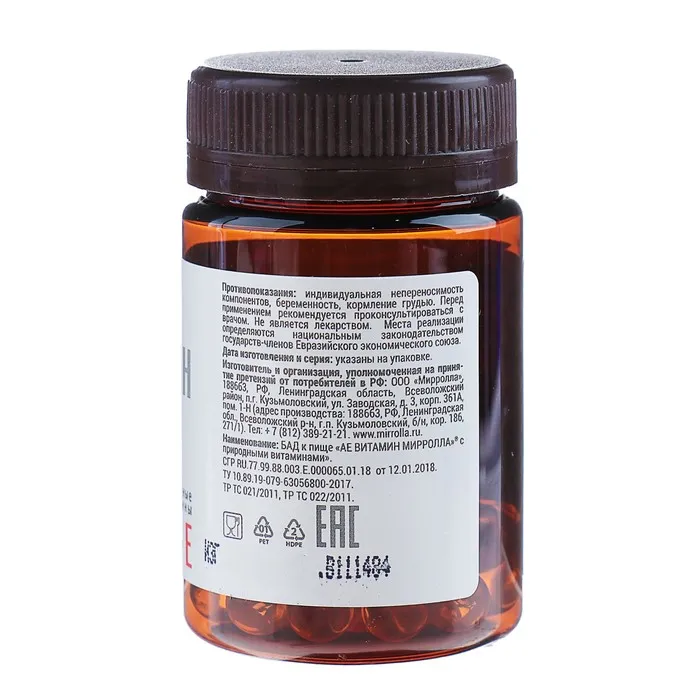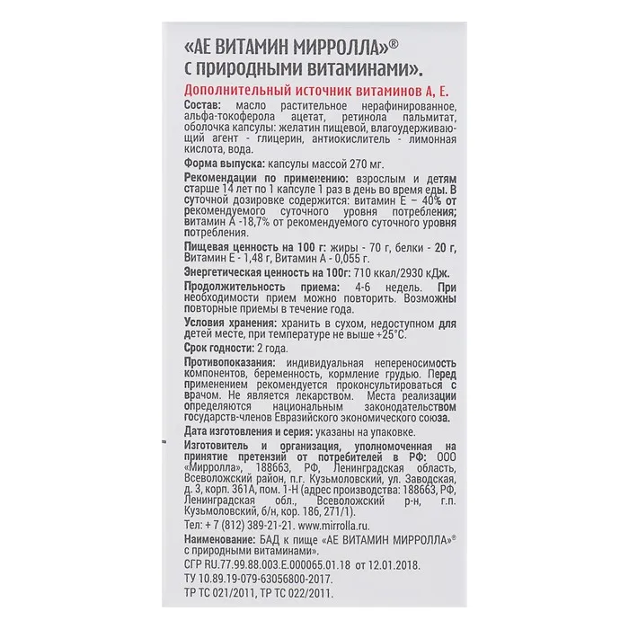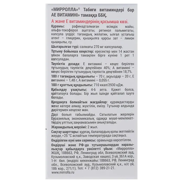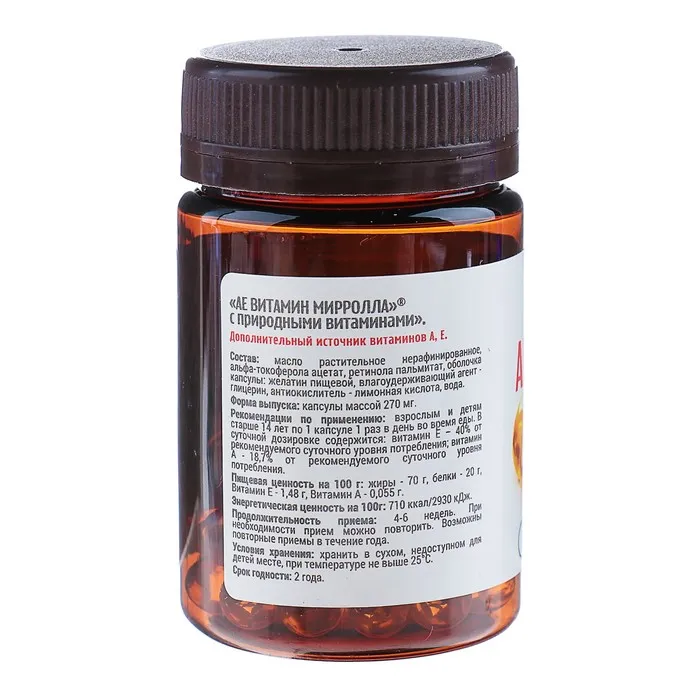 Пищевая добавка Mirrolla «АЕ ВИТамин» с природными витаминами, 30 капсул — Характеристики