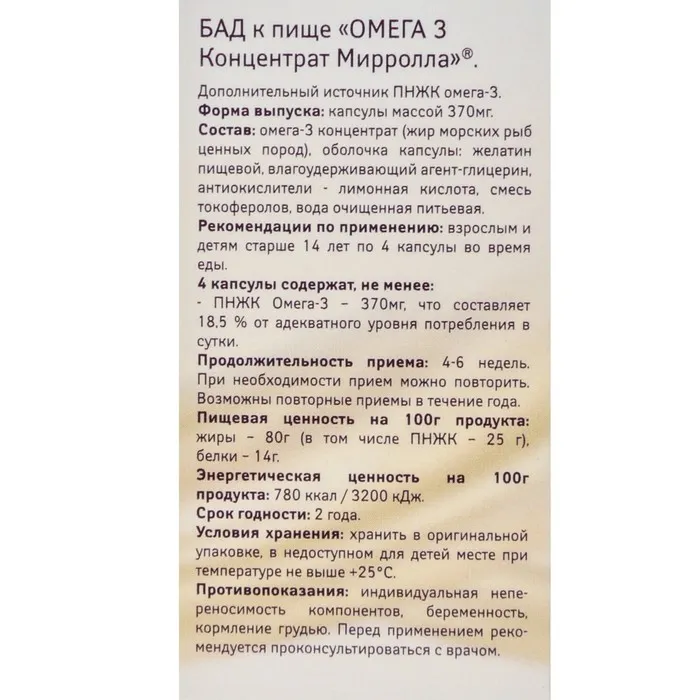 Состав: омега-3 концентрат (жир морских рыб ценных пород), оболочка капсулы (желатин пищевой, Е422, Е330, смесь токоферолов, вода очищенная питьевая).