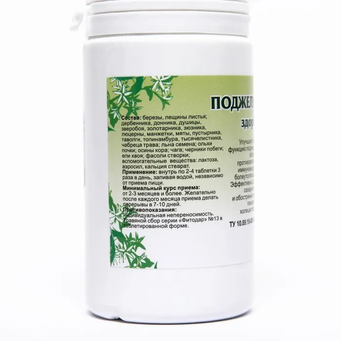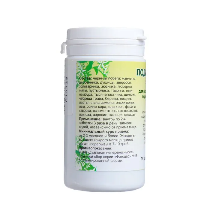 Состав: березы, лещины, мяты листья, горца, дербенника, донника, душицы, зверобоя, золотарника, зюзника, люцерны, манжетки, мяты, первоцвета, подмаренника, полыни Божье дерево, пустырника, таволги, топинамбура, тысячелистника, цикория, чабреца трава, ели хвоя, льна семена, ольхи почки, осины кора, фасоли створки, черники побеги, вспомогательные вещества лактоза, кальция стеарат, аэросил.