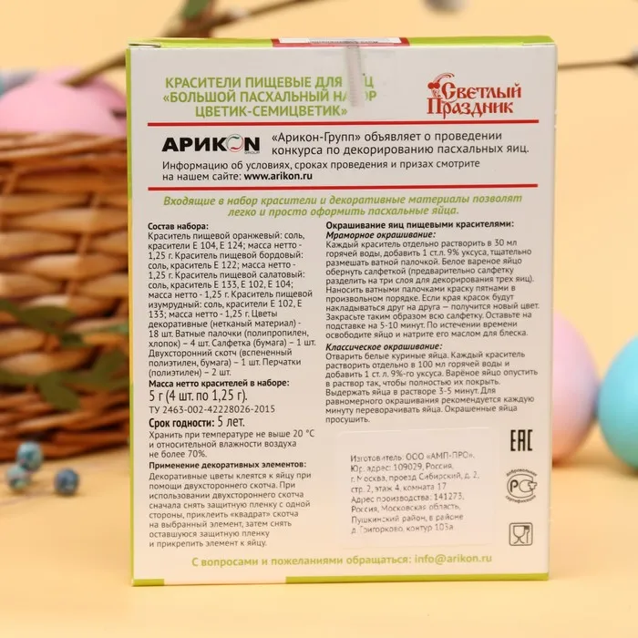 Пищевой краситель для яиц "Пасх. набор Цветик-семицветик" 16 шт. — Характеристики