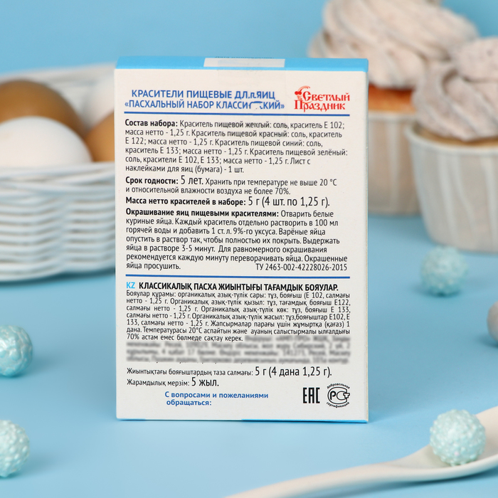 Краситель пищевой жёлтый: соль, краситель Е102; масса нетто - 1,25 г. Краситель пищевой красный: соль, краситель Е122; масса нетто - 1,25 г. Краситель пищевой синий: соль, краситель Е 133; масса нетто - 1,25 г. Краситель пищевой зелёный: соль, красители Е102, Е133; масса нетто - 1,25 г. Лист с наклейками для яиц (бумага) - 1 шт.