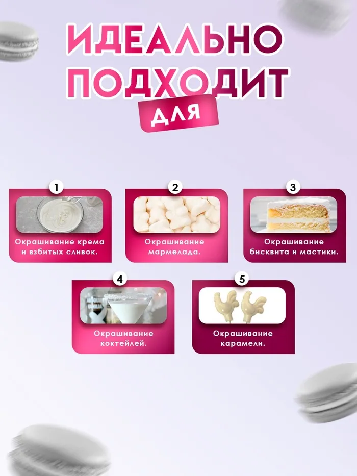 Предназначен для придания окраски бисквитам, кремам (масляный, белковый, заварной, сливочный, крем- чиз), муссам, желе, мармеладу, мороженому, взбитым сливкам, тесту, сахарной мастике, безе, макарунам, леденцам, напиткам, десертам. Подходит для окрашивания яиц. Можно использовать для творчества: мыловарение, слаймы, полимерная глина.
