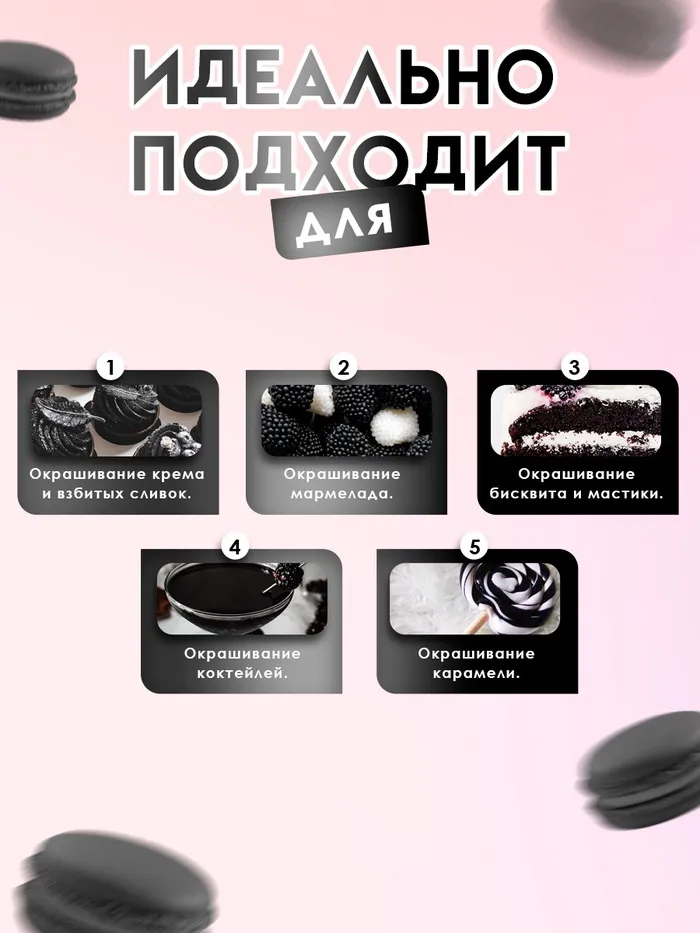 Предназначен для придания окраски бисквитам, кремам (масляный, белковый, заварной, сливочный, крем- чиз), муссам, желе, мармеладу, мороженому, взбитым сливкам, тесту, сахарной мастике, безе, макарунам, леденцам, напиткам, десертам. Подходит для окрашивания яиц. Можно использовать для творчества: мыловарение, слаймы, полимерная глина.