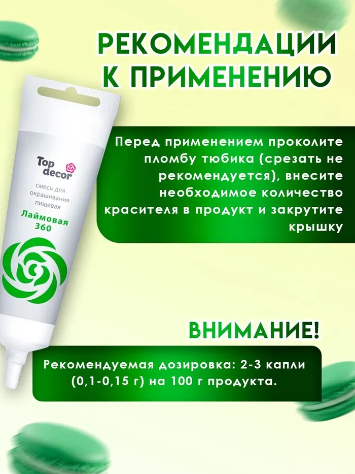 Рекомендации к применению: Перед применением проколите пломбу тюбика (срезать не рекомендуется), внесите необходимое количество красителя в продукт и закрутите крышку. Рекомендуемая дозировка 2-3 капли (1-1,5 грамма) на 100 грамм продукта.