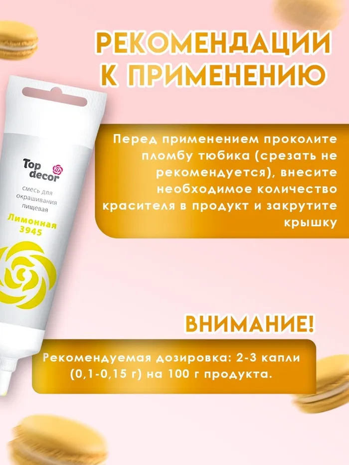 Краситель водорастворимый с высокой концентрацией красящего пигмента. Густая консистенция позволяет ему хорошо окрашивать по всей массе основные кондитерские полуфабрикаты (желе, мусс, крем, тесто, мастика и другие), не изменяя их консистенцию. Не имеет вкуса и аромата, благодаря чему сохраняет первоначальные вкусовые свойства окрашиваемого продукта.