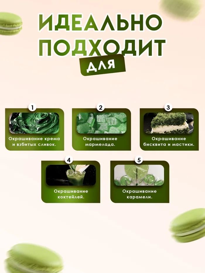 Предназначен для придания окраски бисквитам, кремам (масляный, белковый, заварной, сливочный, крем- чиз), муссам, желе, мармеладу, мороженому, взбитым сливкам, тесту, сахарной мастике, безе, макарунам, леденцам, напиткам, десертам. Подходит для окрашивания яиц. Можно использовать для творчества: мыловарение, слаймы, полимерная глина.