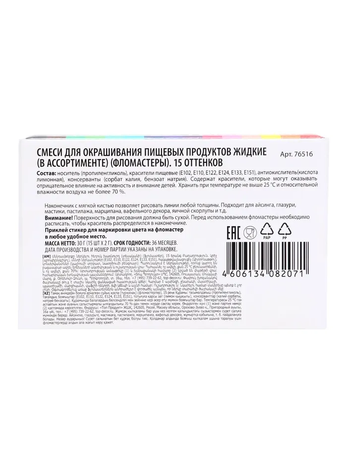 Каждый маркер содержит пищевой краситель, безопасный для употребления, что делает их идеальными для использования в кулинарии. Широкий спектр оттенков, включая яркие и пастельные тона, дает вам возможность создавать разнообразные дизайны, от веселых и игривых до элегантных и утонченных.