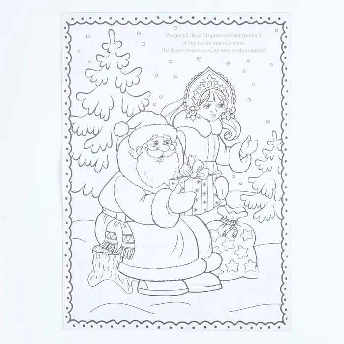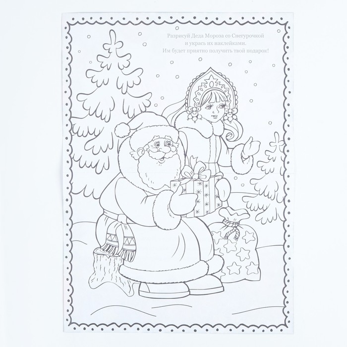 2. Затем на обратной стороне письма малыш может раскрасить новогоднюю картинку и декорировать её вырезными наклейками из набора — так будет волшебнее!