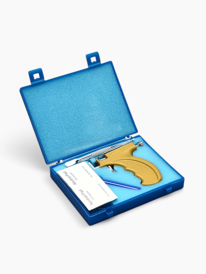 - Обеспечивает точное и безопасное выполнение пирсинга уха.