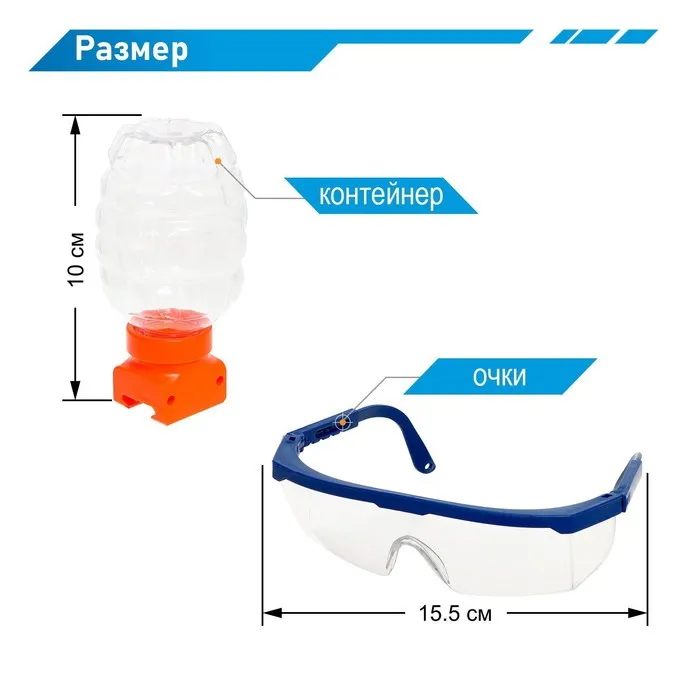 - В комплекте контейнер для пуль в виде гранаты, съёмный глушитель, защитные очки и USB-зарядка.