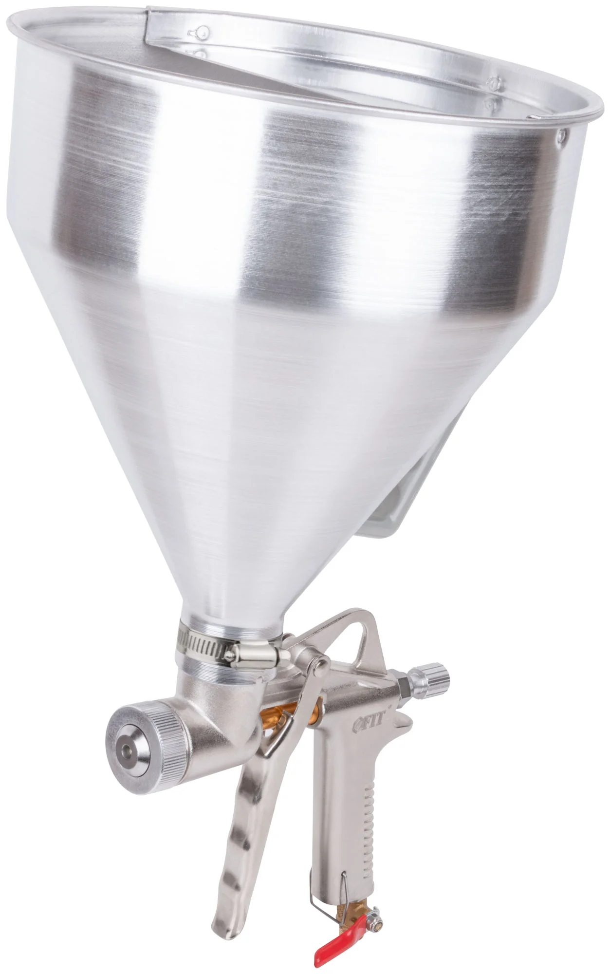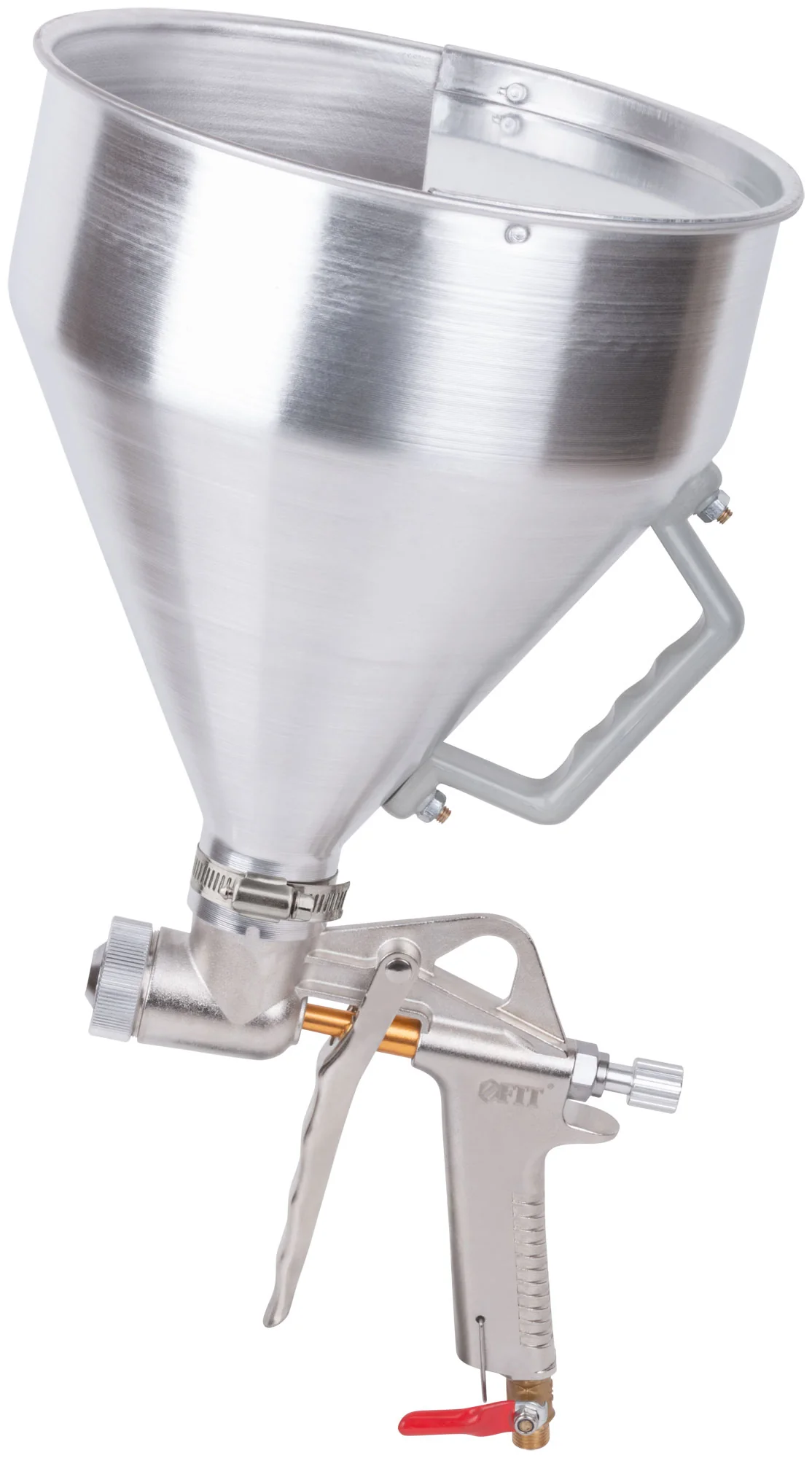 Пистолет оснащен алюминиевым верхним бачком, который обеспечивает легкость конструкции и долговечность. С помощью регулировки расхода строительных смесей можно легко настроить поток материала в зависимости от задач. Приспособление работает в диапазоне давления 4,0 - 6,0 бар и расходует воздух от 200 до 300 литров в минуту, что делает его идеальным выбором для профессионального использования.