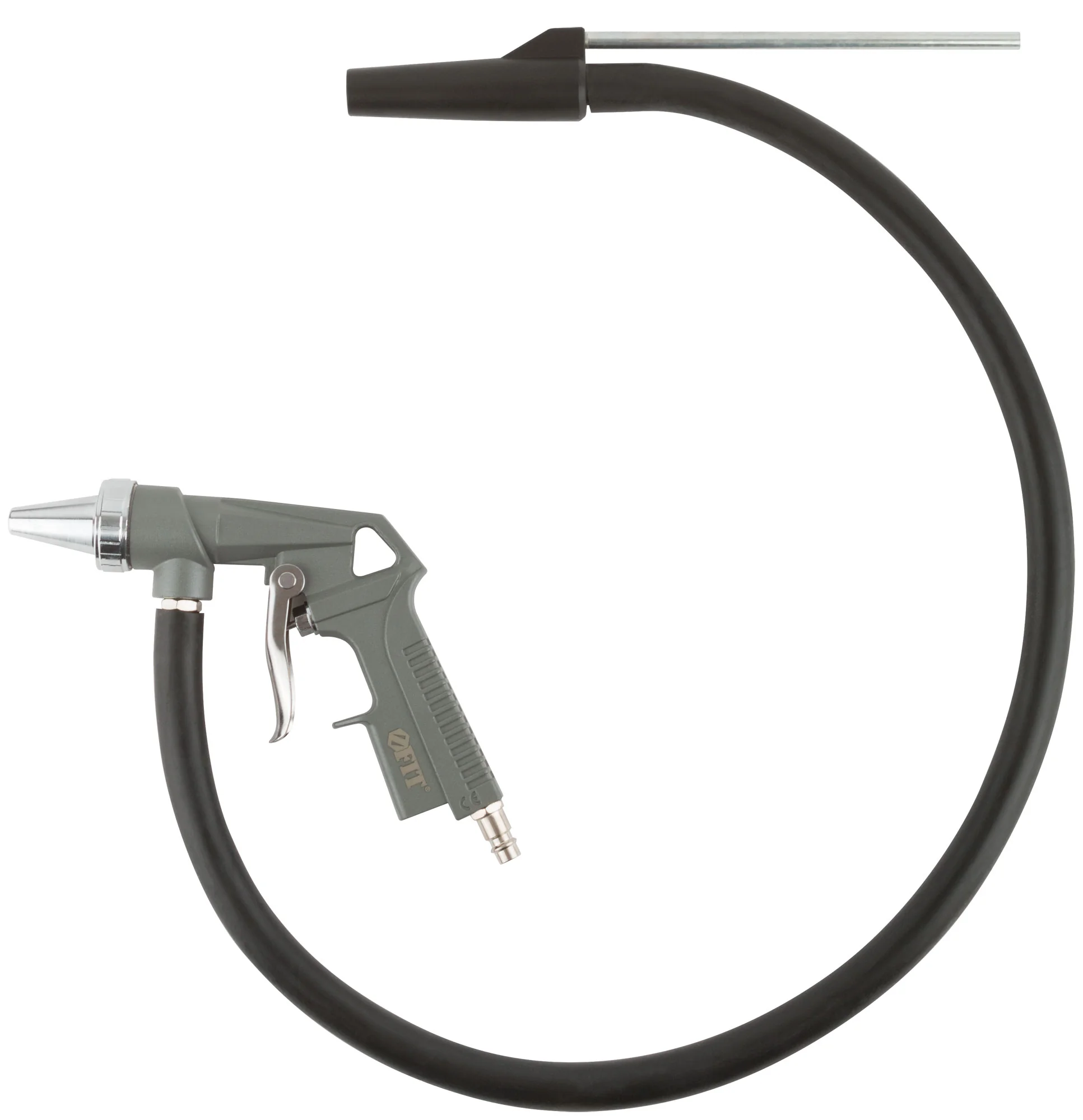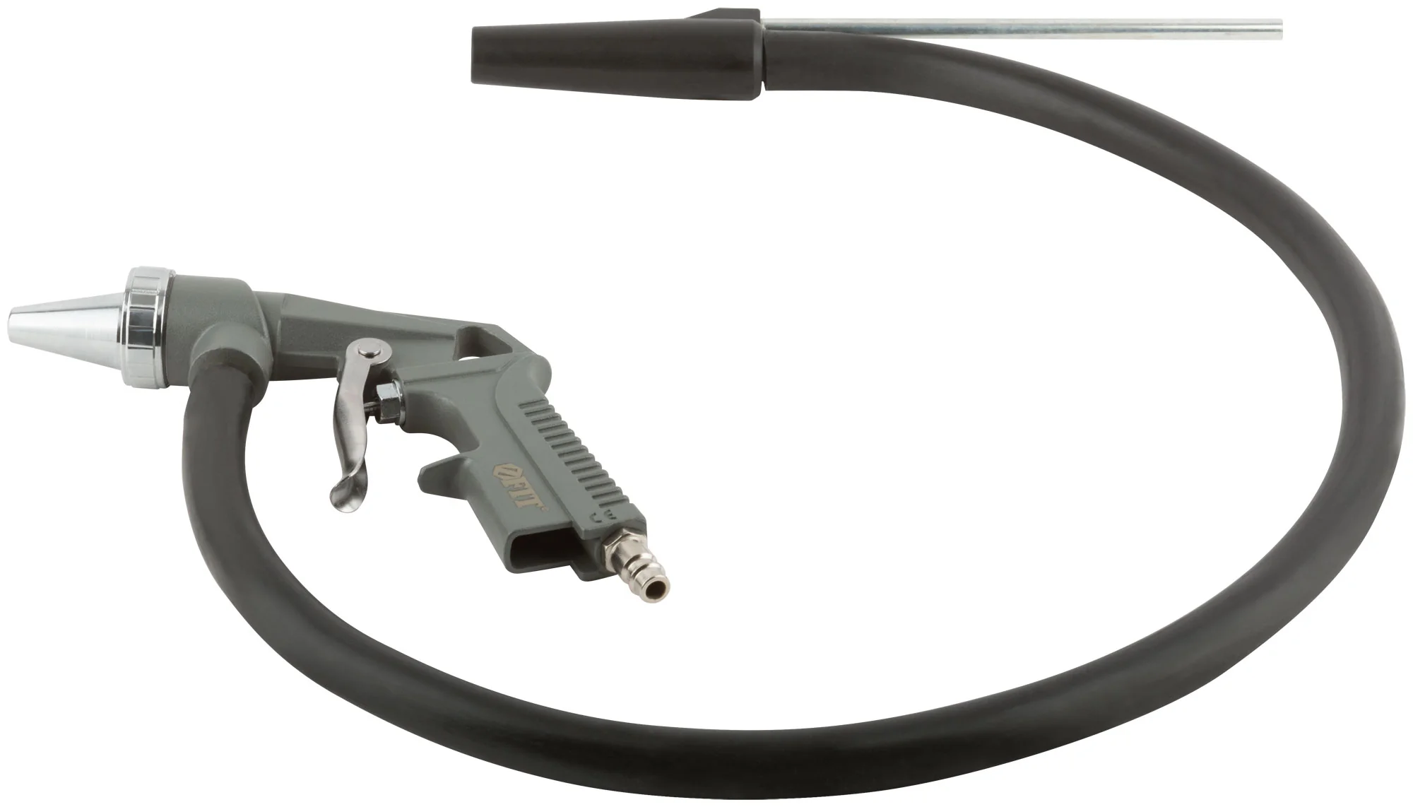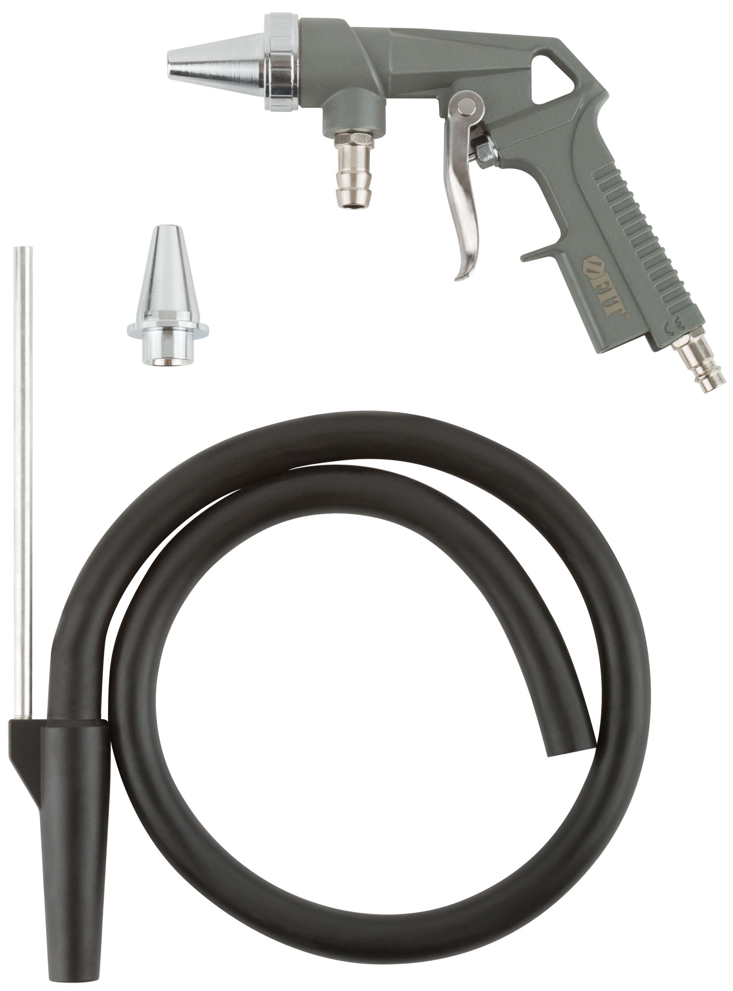 Корпус пистолета изготовлен из алюминия с порошковым покрытием, что обеспечивает его долговечность и устойчивость к коррозии. Резиновый шланг длиной 1 метр позволяет легко маневрировать инструментом в труднодоступных местах, а хромированная насадка из инструментальной стали гарантирует высокую износостойкость.