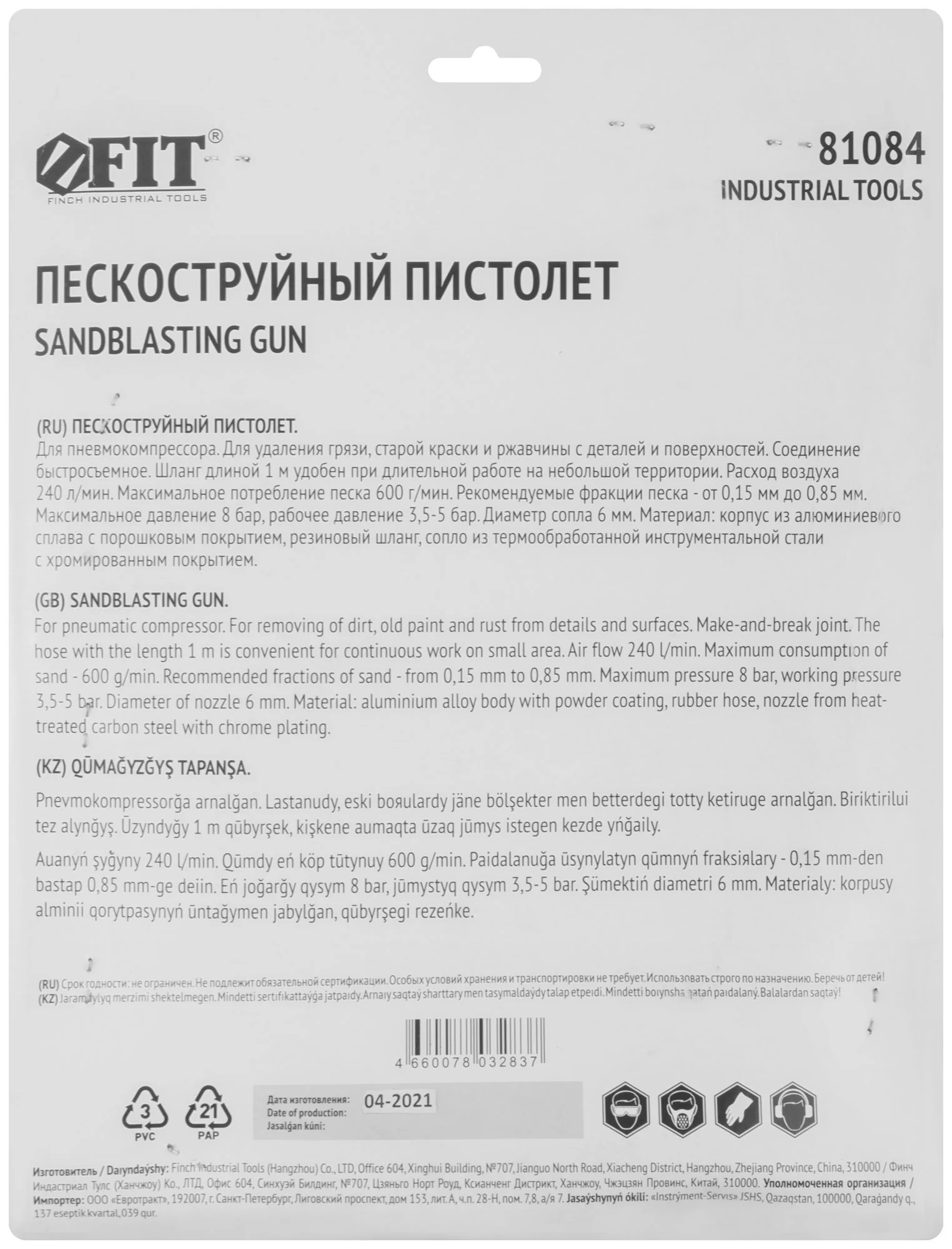 Выберите пескоструйный пистолет FIT, артикул 81084, чтобы обеспечить надежное и эффективное удаление загрязнений с любых поверхностей.
