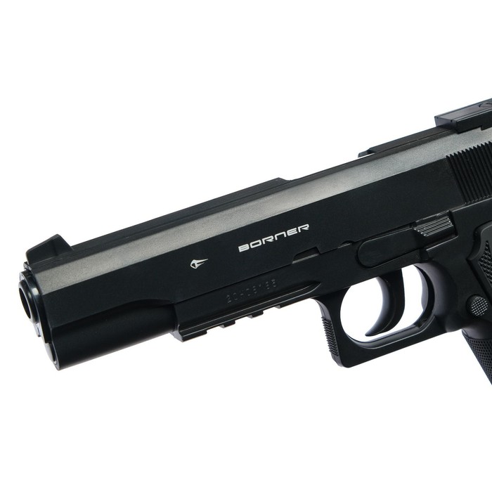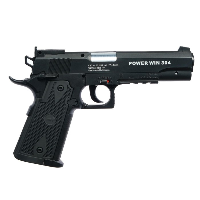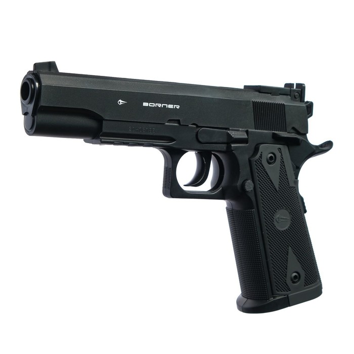 Модель пневматического оружия Borner Power Win 304 имеет много схожих черт с легендарным Colt M1911. Пистолет изготавливается из высокопрочного пластика. Неподвижные элементы служат лишь декорацией Borner Power Win 304, но рычаг затворной задержки, предохранители и курок внешне сильно напоминают боевой пистолет. На месте, где выбрасываются гильзы, расположена имитация внутреннего ствола.