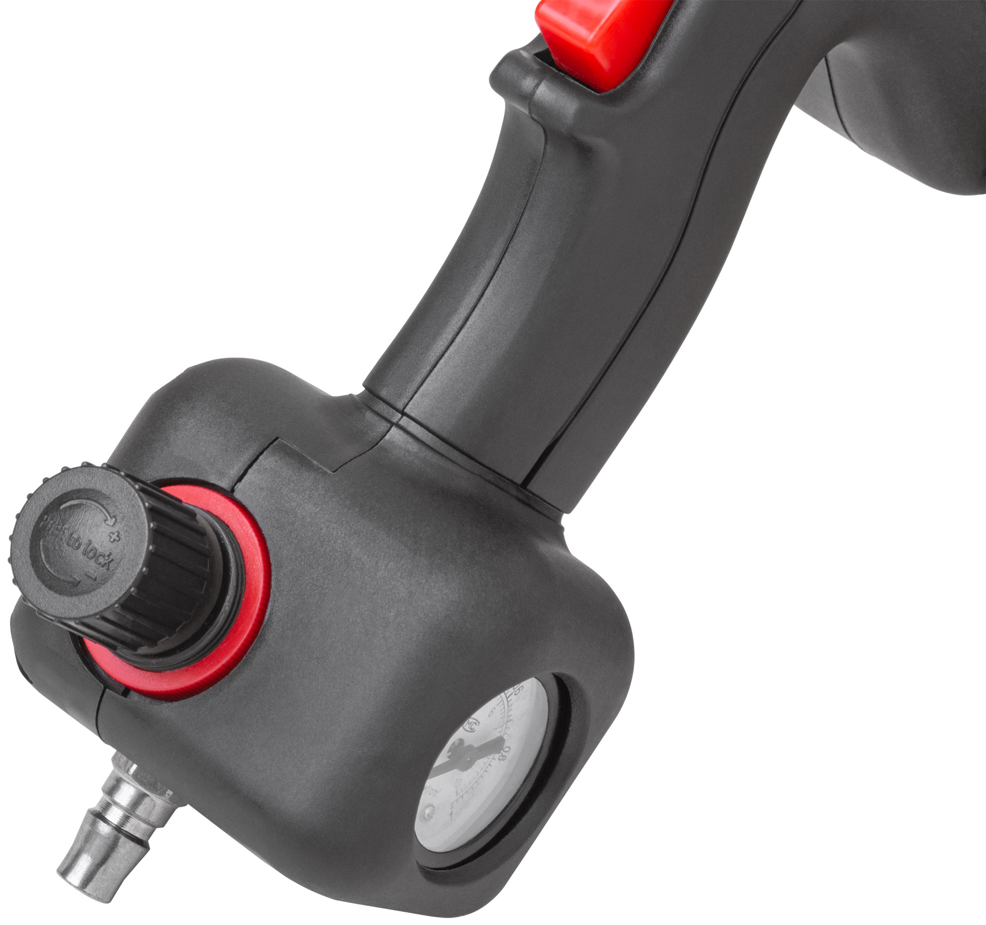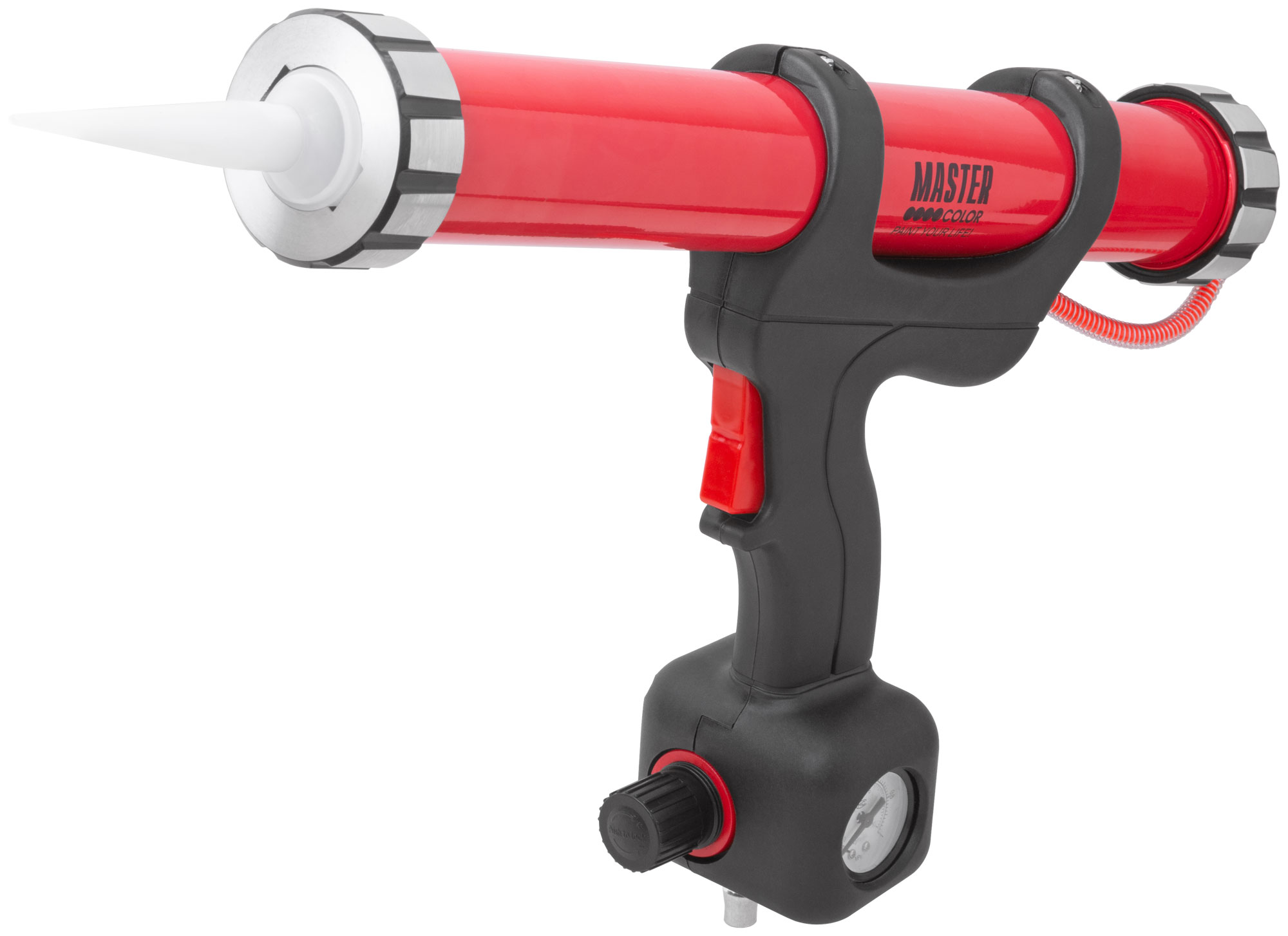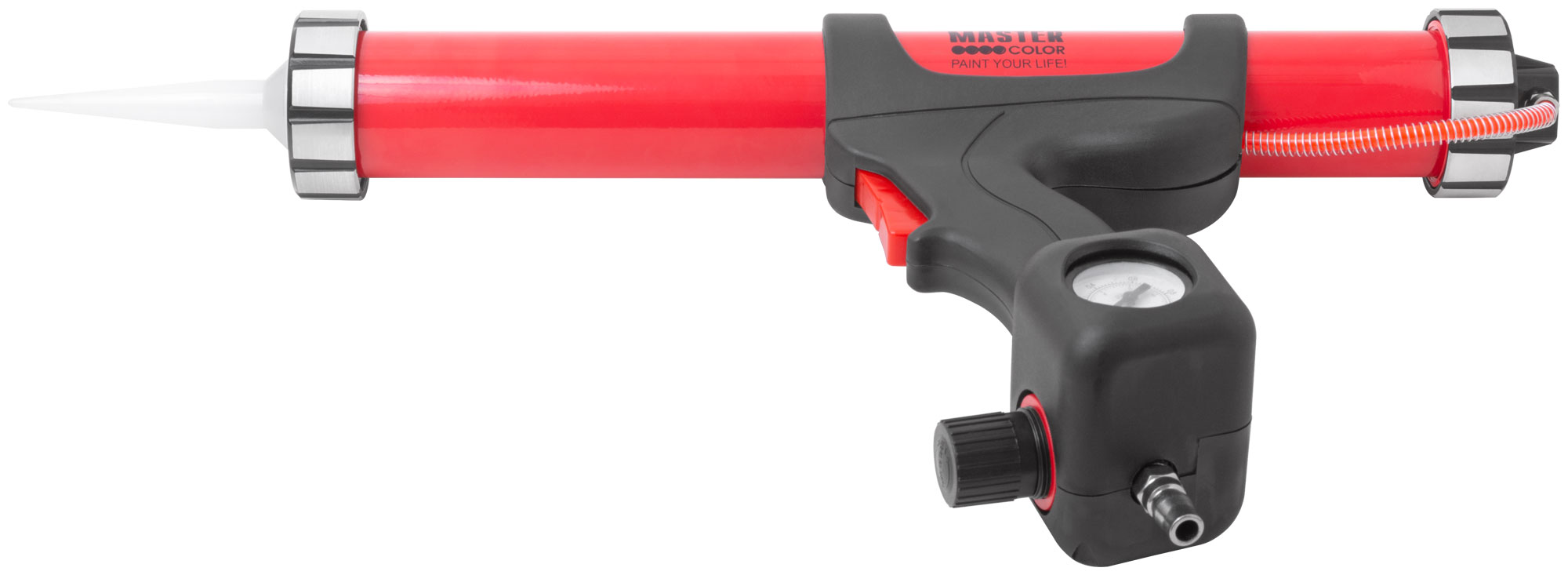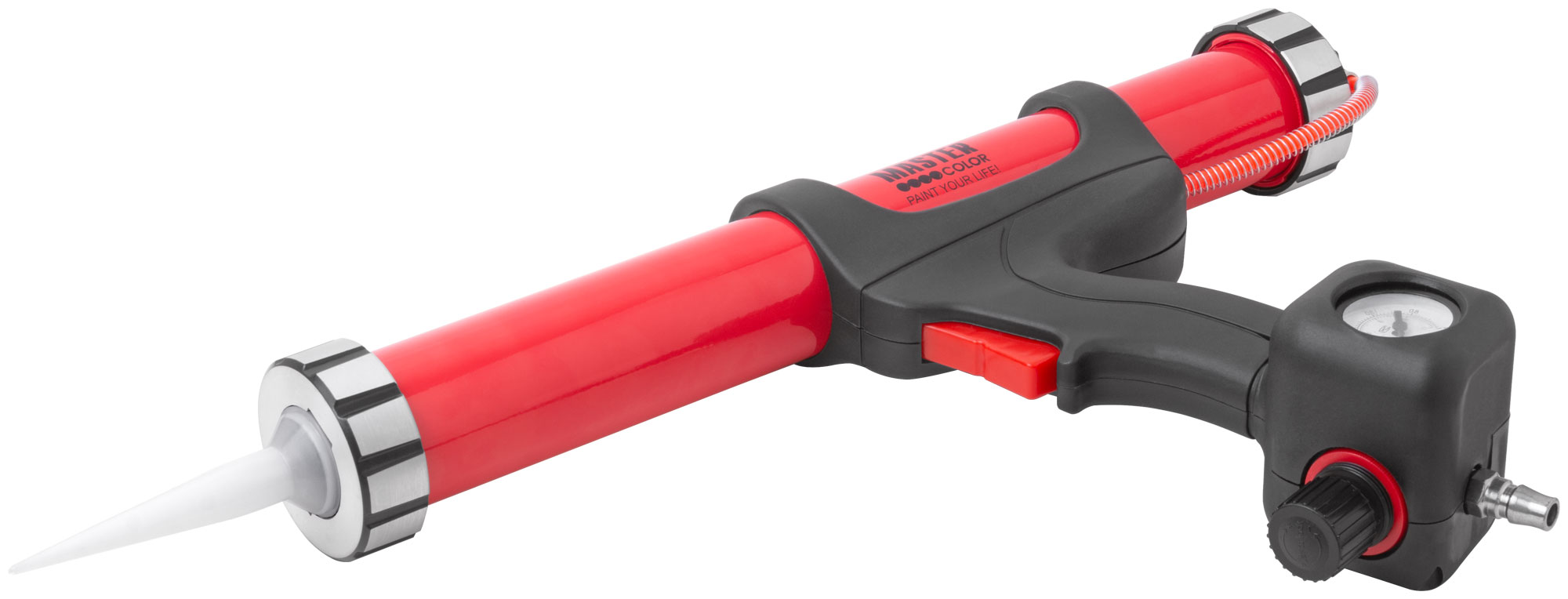 Конструкция пистолета включает в себя датчик давления, который помогает контролировать процесс нанесения. Изготовленный из легкого алюминия и пластика, инструмент снижает утомляемость и удобен в использовании благодаря эргономичной рукоятке.
