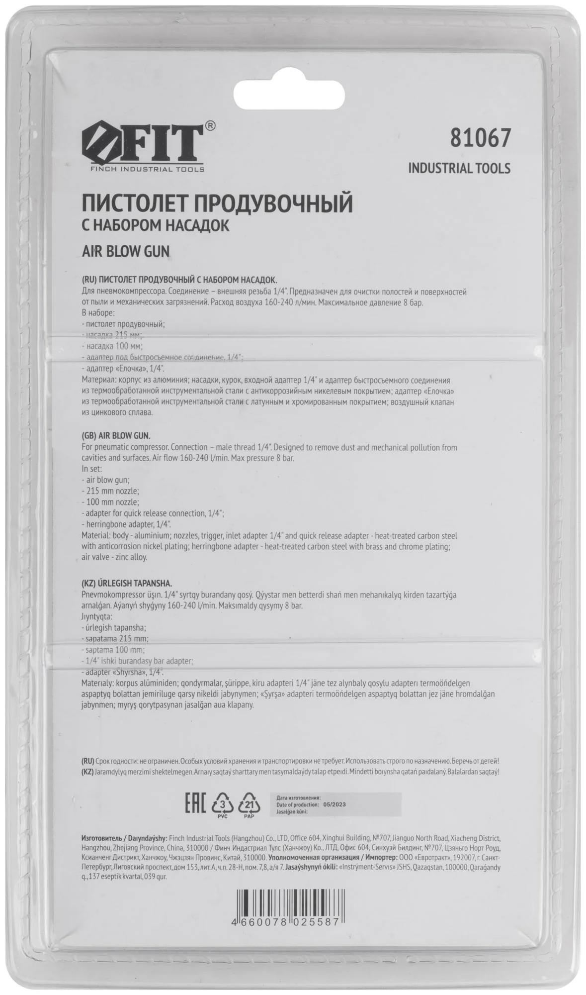 Пистолет продувочный FIT с набором насадок для пневмокомпрессора