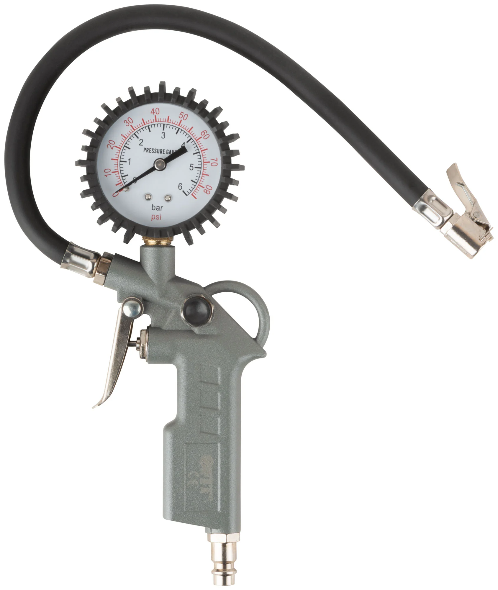 Конструкция пистолета выполнена из прочного алюминия, что обеспечивает долговечность и надежность в использовании. Манометр с продольным расположением и шагом 0,1 атм позволяет точно отслеживать давление, а диаметр выходного отверстия 1/4” делает его совместимым с большинством стандартных систем.