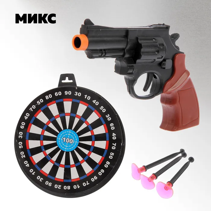 - В комплекте пистолет, мишень и три мягкие стрелы с присосками.