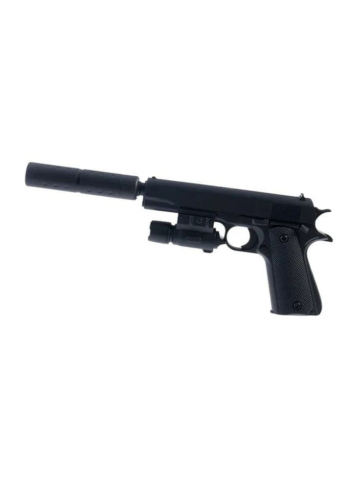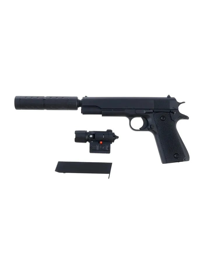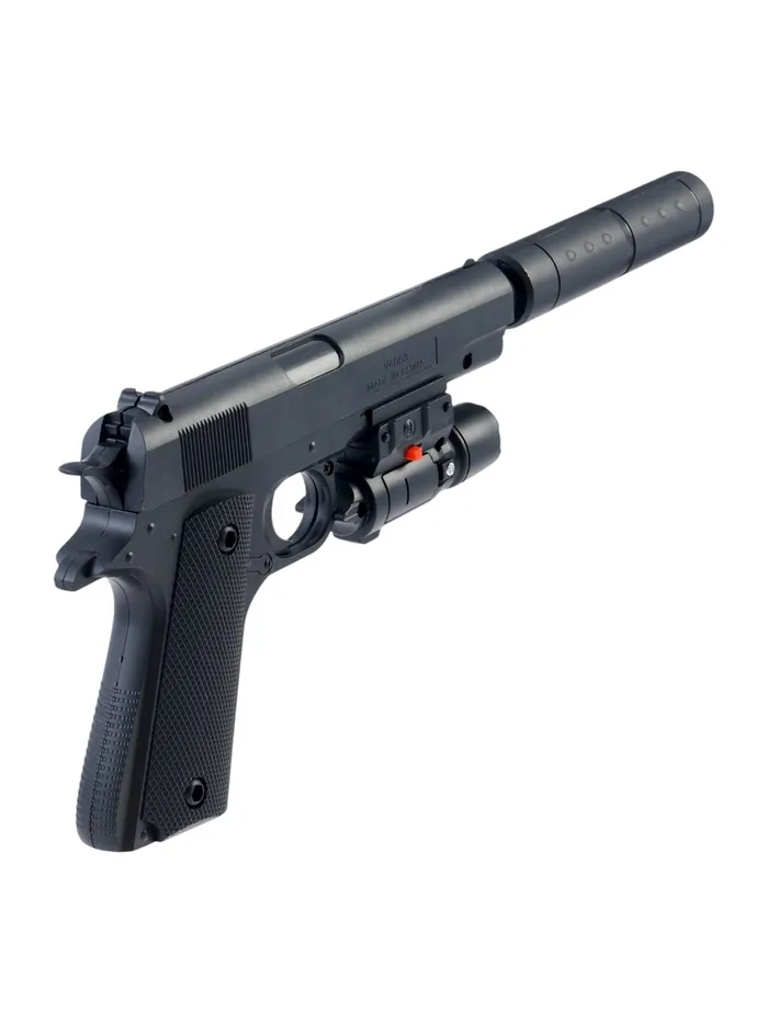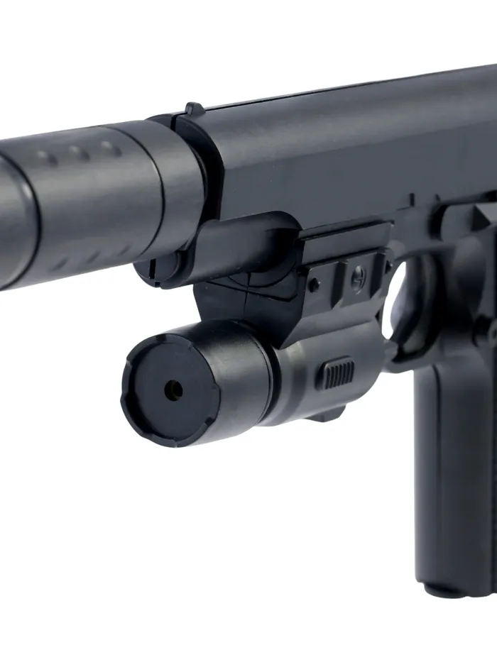 Тактический пистолет с лазером и глушителем — профессиональный арсенал для юного бойца. Лазерный прицел и съемный глушитель создают полное погружение в игру, а 6-мм пульки обеспечивают безопасность. Подходит для тренировки меткости и тактических миссий.