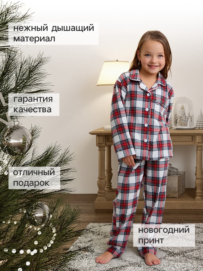 Пижама для девочки новогодняя из фланели (рубашка и брюки) KAFTAN, размер 34 (122-128 см), красно-белая — Характеристики