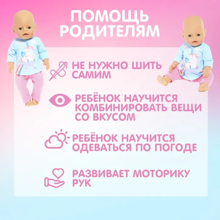 Пижама-костюм для кукол «Единорог», 40-44 см, текстиль, на липучках — Характеристики