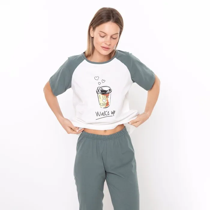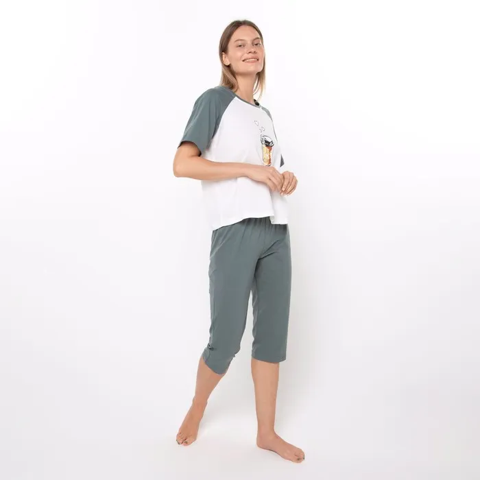 Пижама женская (футболка, бриджи) Wake up, серо-зелёная, размер 46 — Характеристики