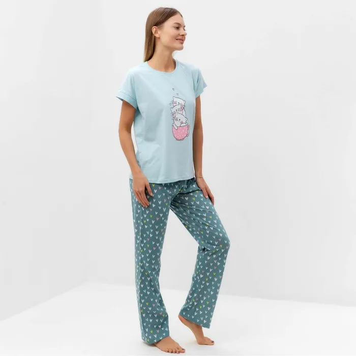 Пижама женская (футболка, брюки) «Котята», голубая, размер 44 — Характеристики