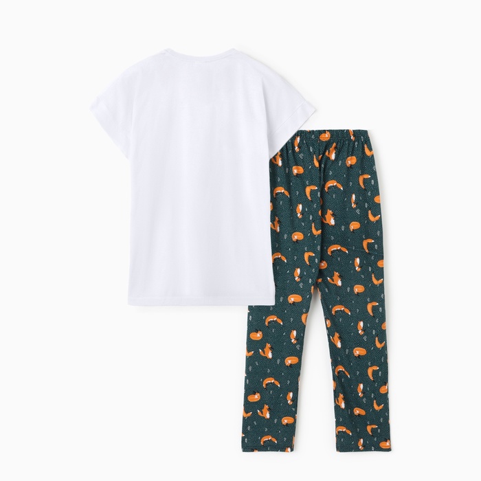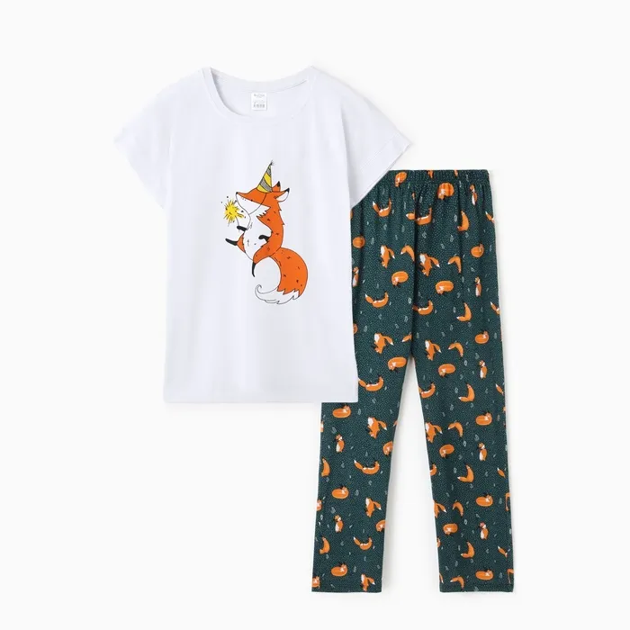 Пижама женская (футболка/брюки) "Лисёнок с бенгальским огнём", цвет белый/зелёный, размер 52