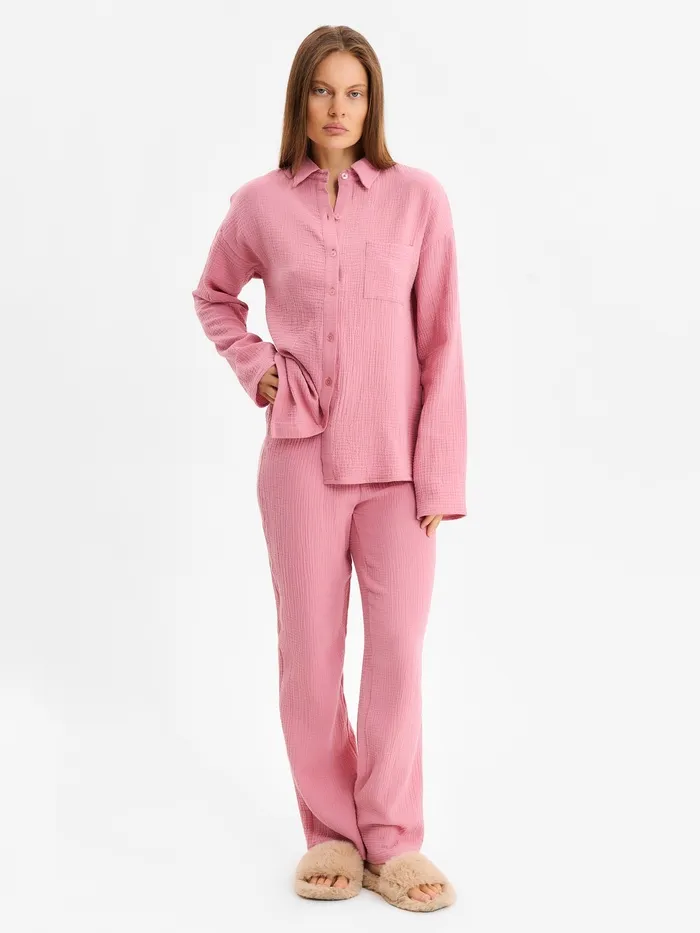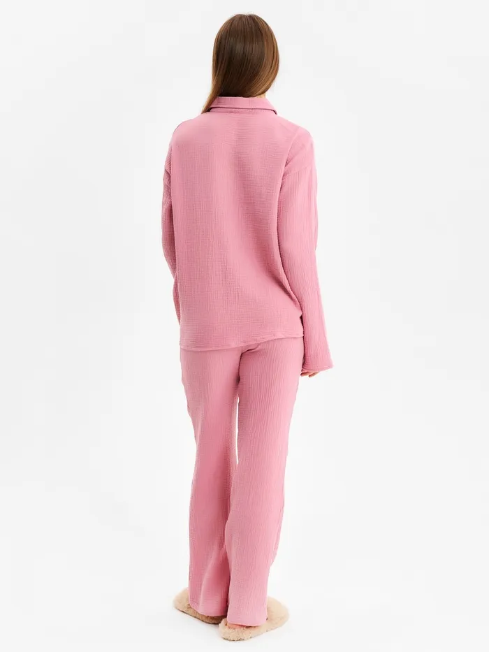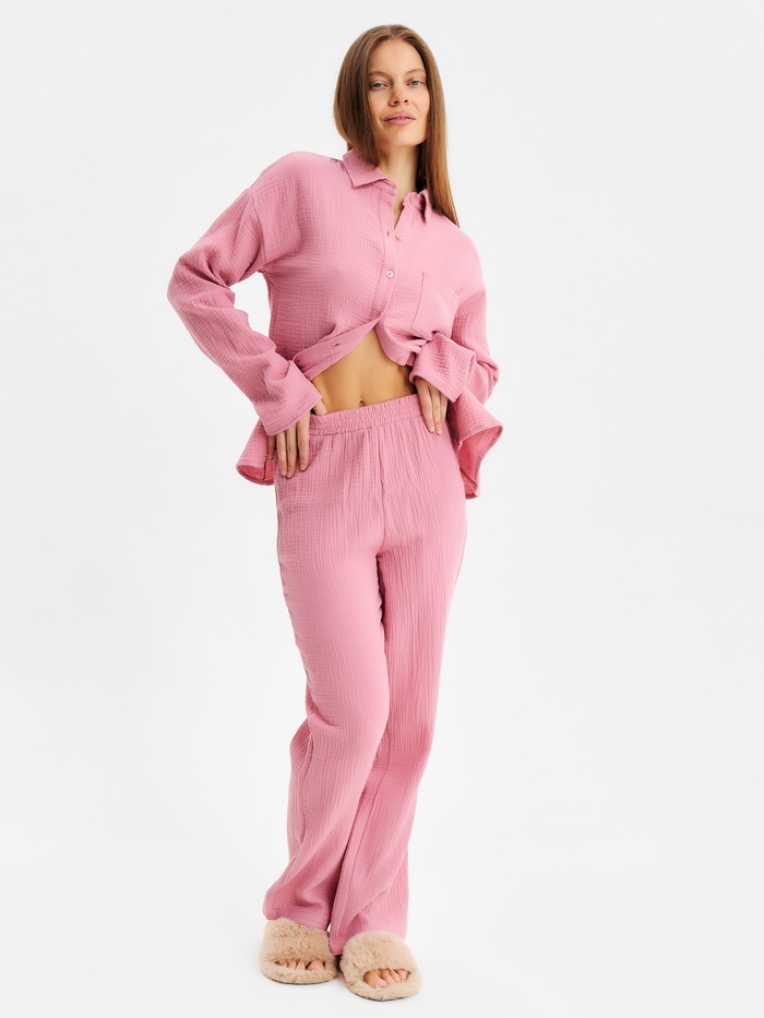 Роскошный комплект для дома и отдыха поможет создать атмосферу уюта и расслабления. Пудрово-розовый цвет, изысканный покрой и высококачественный муслин создают эффект гармонии и лёгкости в использовании. Этот костюм станет вашим надёжным спутником в вечерней релаксации.