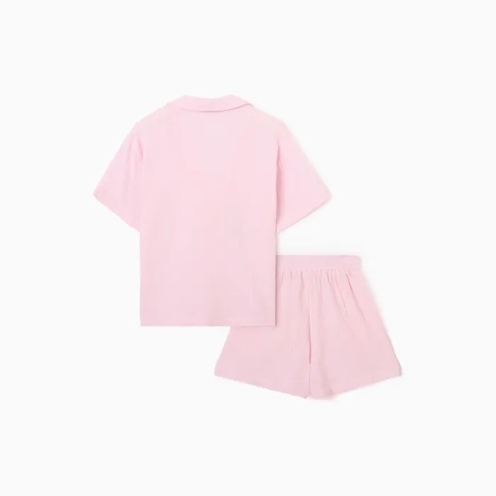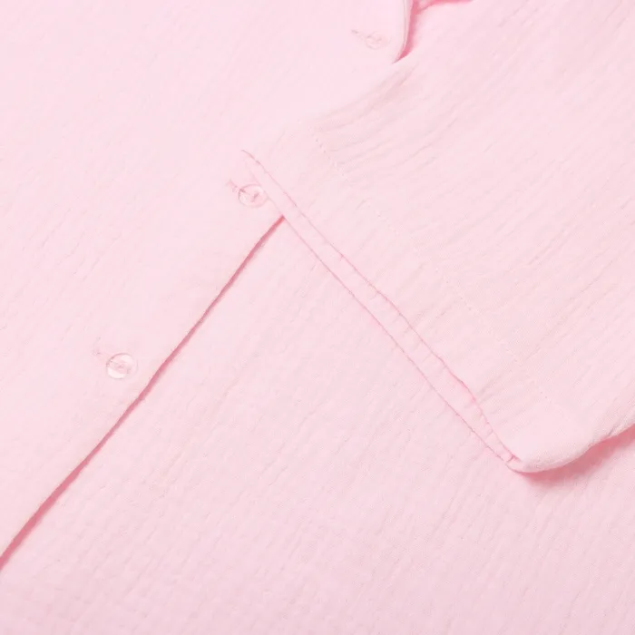 - Комплект включает свободную рубашку с короткими рукавами и шорты.