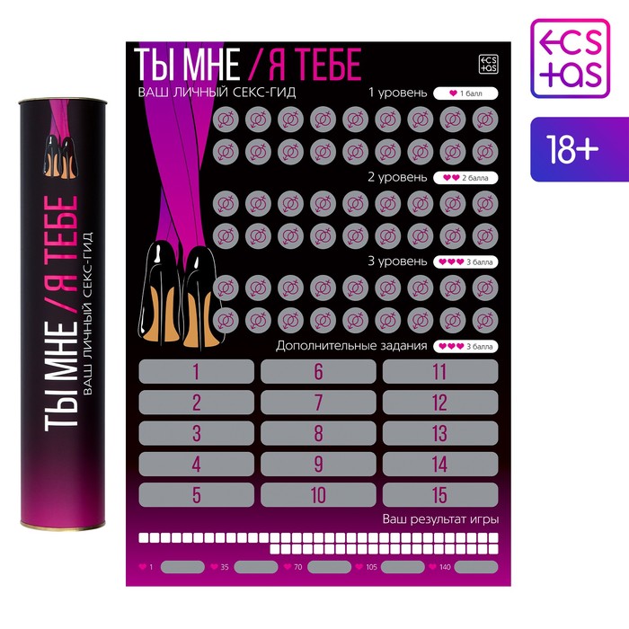 Секс-позы делятся на 3 уровня сложности. За позы 1-го уровня вы получите по 1 баллу, за позы 2-го уровня — 2 балла, за позы 3-го уровня — 3 балла. Вместе или по очереди выбирайте любой круг и стирайте скретч-слой, чтобы узнать позу. Если под скретч-слоем вместе с позой оказалась цветная цифра, то нужно стереть поле с заданием под соответствующей цифрой. Это может быть задание для него, для неё или для двоих. Их необязательно выполнять, но каждое выполненное задание принесёт дополнительные баллы и подарит новый опыт в ваших сексуальных отношениях.