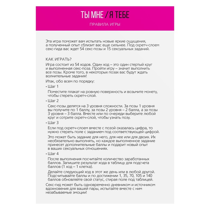 После выполнения задания посчитайте количество заработанных баллов. Запишите результат хода в таблицу для подсчёта баллов (1 ход — 1 клетка). Делайте следующий ход в этот же день или в любой другой. Подсчитывайте баллы и по достижении 35, 70, 105 и 140 баллов обновляйте свой статус, стирая поля на любовной шкале. Секс-гид может быть одновременно дневником и источником вдохновения для вашей пары. Испытайте вместе с ним незабываемые эмоции!