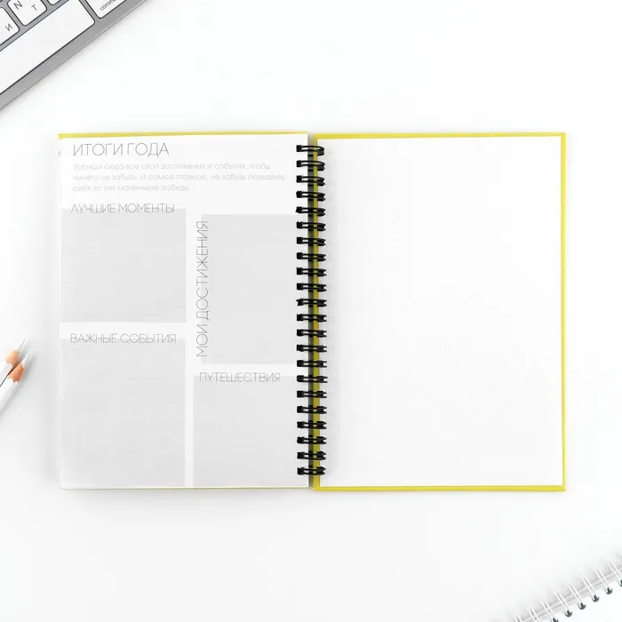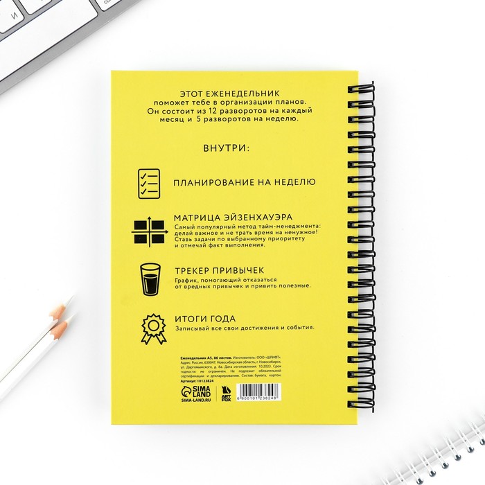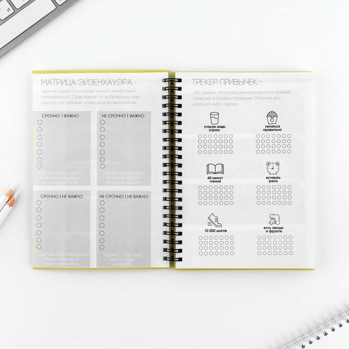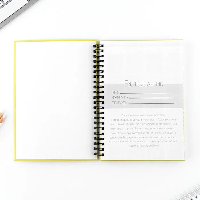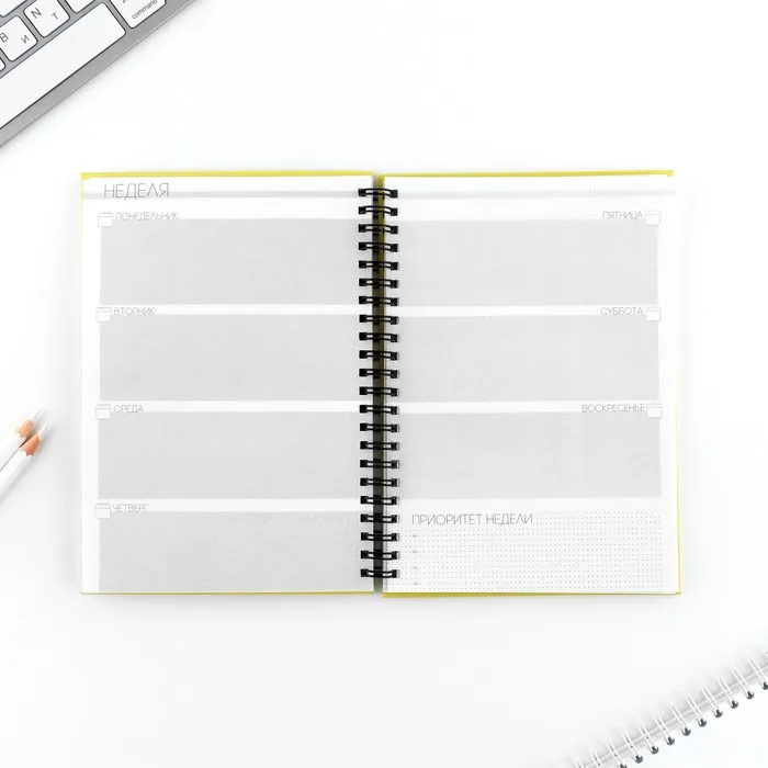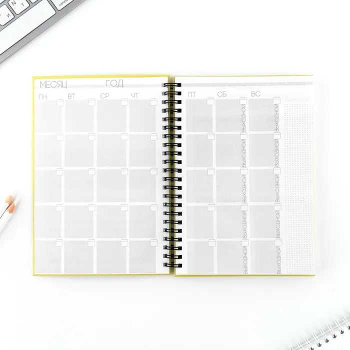 Этот еженедельник поможет тебе в организации планов. Он состоит из 12 разворотов на каждый месяц и 5 разворотов на неделю.