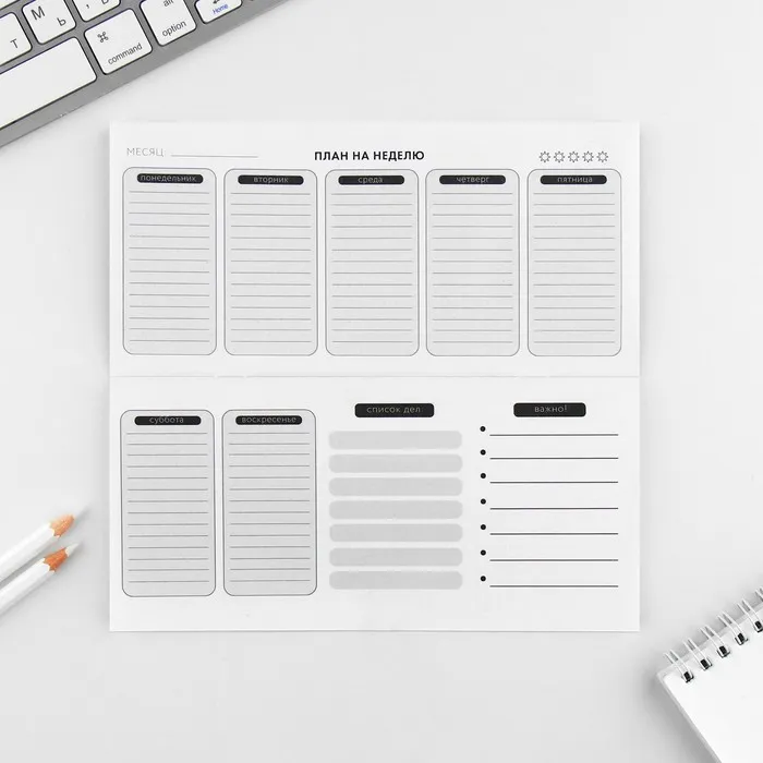 Твой планер рассчитан на 12 недель. Незаменим для тех, кто выполняет много различных задач и хочет видеть свои планы сразу на всю неделю. Недельный разворот включает в себя: