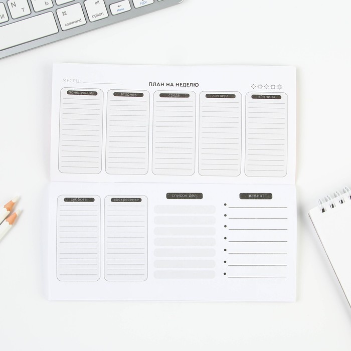 Недельный разворот включает в себя, окошко на каждый день недели и общий список дел.