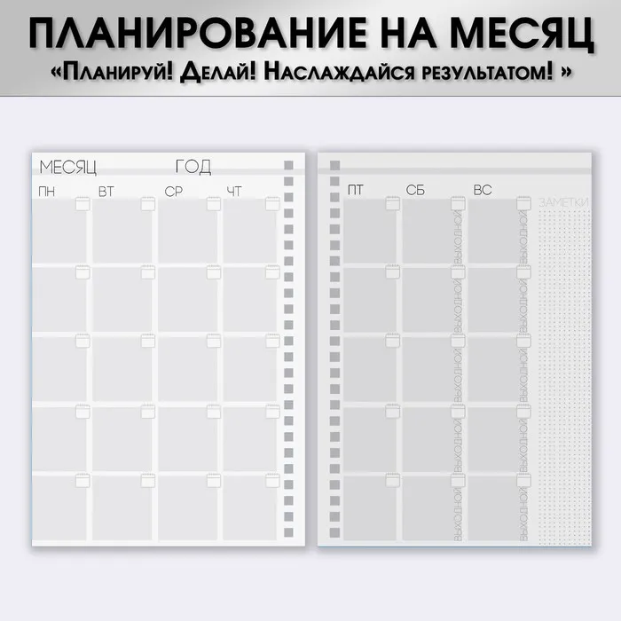 Этот еженедельник поможет тебе в организации планов. Он состоит из 12 разворотов на каждый месяц и 5 разворотов на неделю.