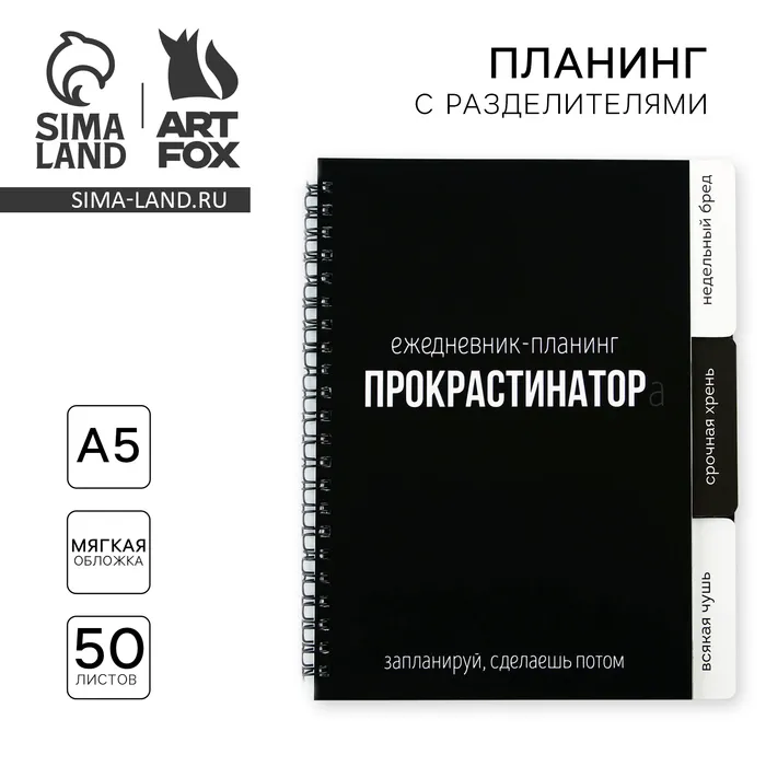 Планер с разделителями «Прокрастинатор», мягкая обложка, формат А5, 50 листов — Характеристики