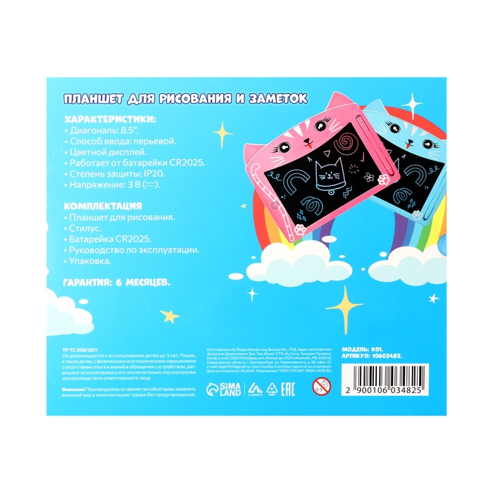 Планшет для рисования и заметок Luazon "кот", 8.5", цветной дисплей, розовый — Характеристики