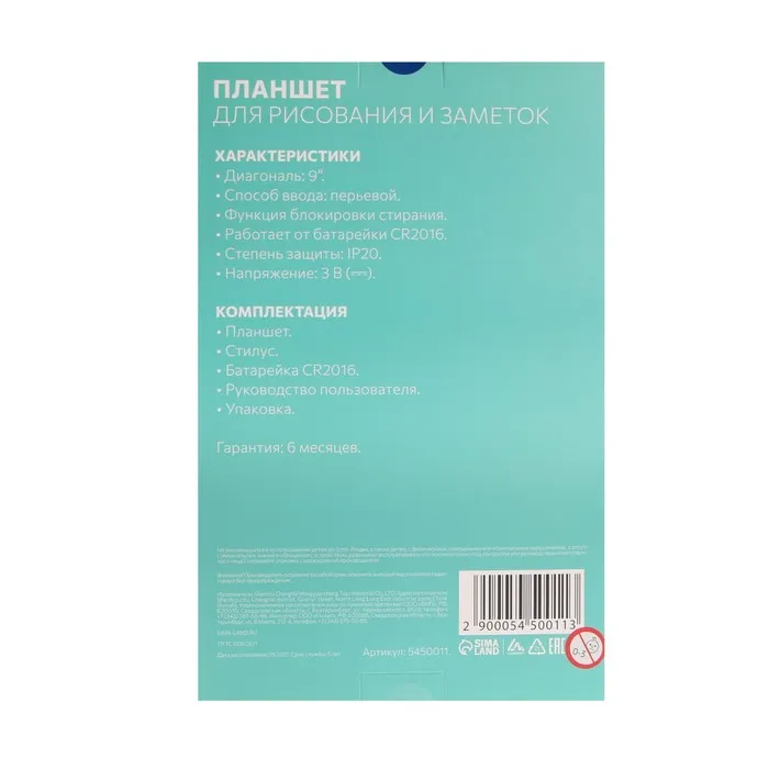Предоставьте детям платформу для творчества вместе с детским планшетом для рисования и заметок LuazON. Будьте уверены в прочности изделия в любых ситуациях благодаря прочному пластику. Питание планшета осуществляется при помощи батарейки CR2032.
