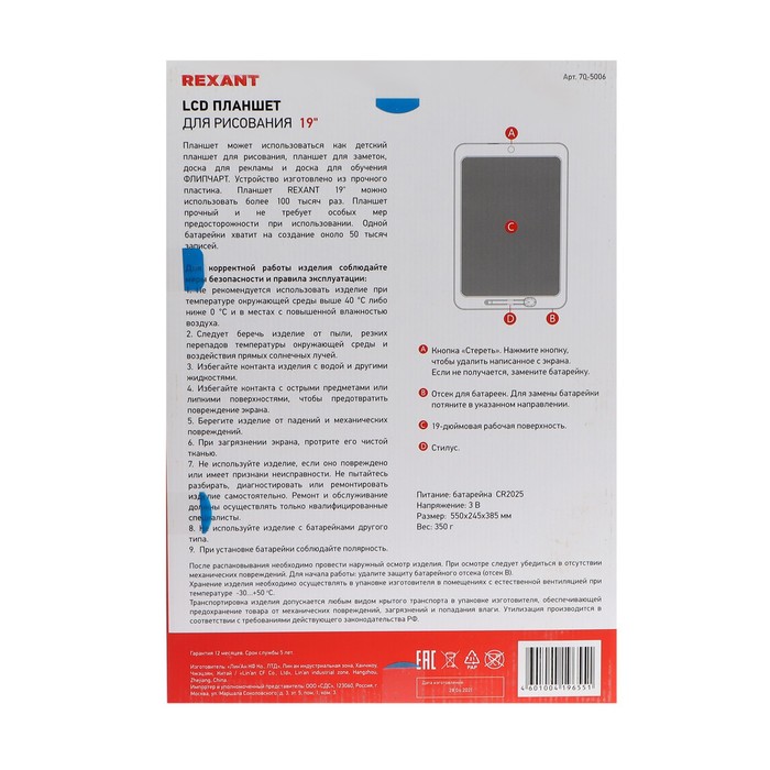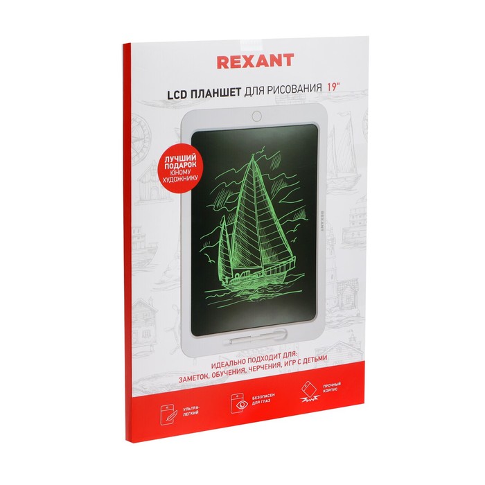 Планшет для рисования Rexant 70-5006, 19'', защита от стирания, белый — Характеристики