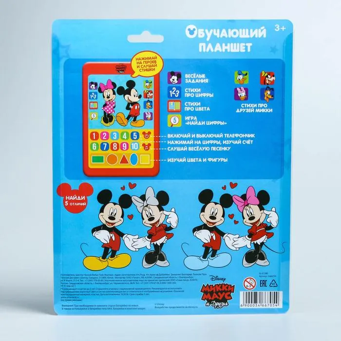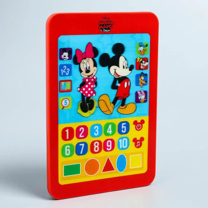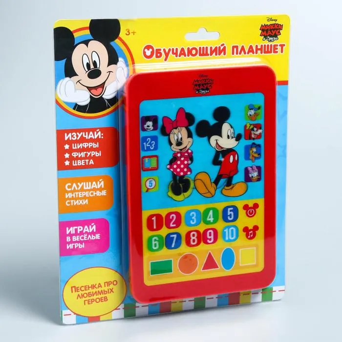 Учимся с любимыми героями! Интерактивный планшет «Микки Маус и друзья» — это увлекательное устройство для первых шагов в обучении. С ним ребёнок освоит цифры, формы и цвета в игровой форме, а весёлые стихи и песенка сделают процесс интереснее.