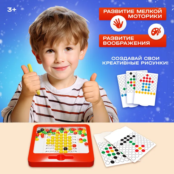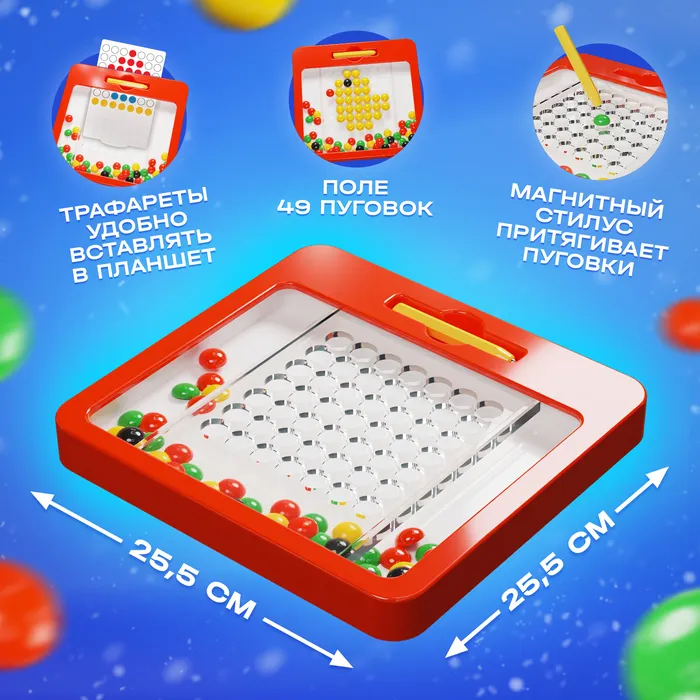 Игра «Магнитное рисование» поможет обучить ребёнка письму в дошкольном возрасте. В комплект входит планшет с разноцветными пуговками и ручка-магнит. Перемещать элементы легко – они сами слушаются палочку с намагниченным наконечником и перелетают в круглые прозрачные ячейки. Малышу не нужно прикасаться к ним руками – чтобы пуговка следовала за стилусом проведите им по понели перемещая в одно из отверстий.