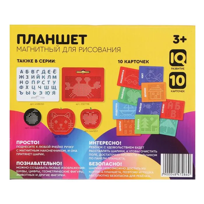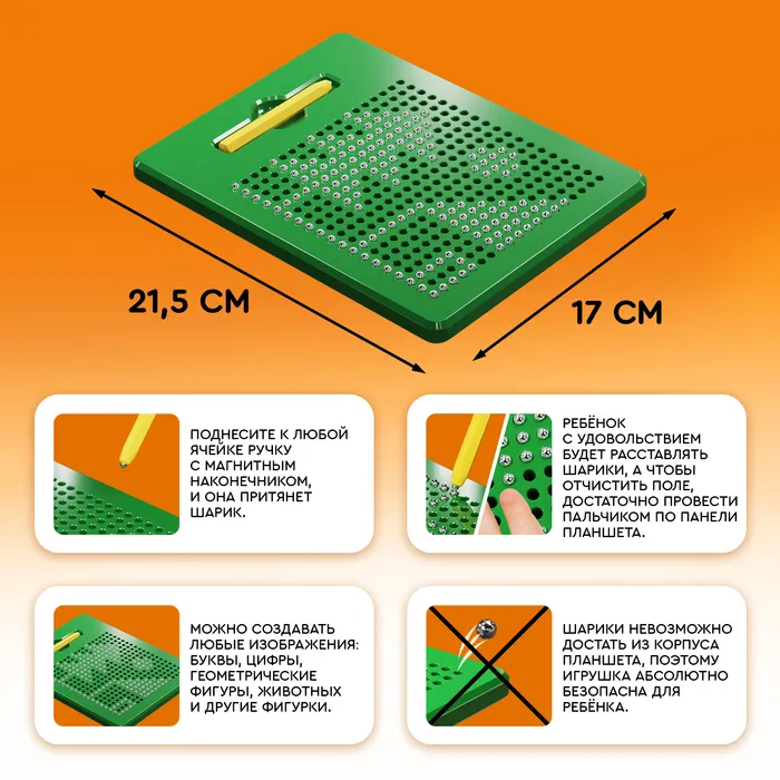 Планшет развивает мелкую моторику, зрительную память и координацию движений. Использование магнитного стилуса и металлических шариков делает процесс рисования увлекательным и обучающим одновременно. Родители могут быть уверены в безопасности материалов, так как планшет изготовлен из прочного пластика.