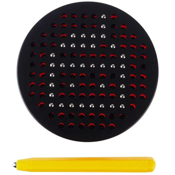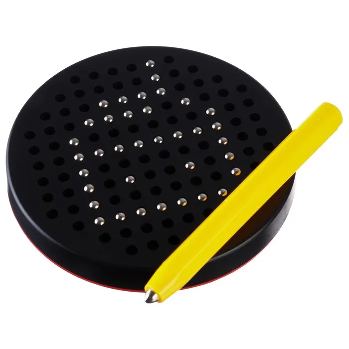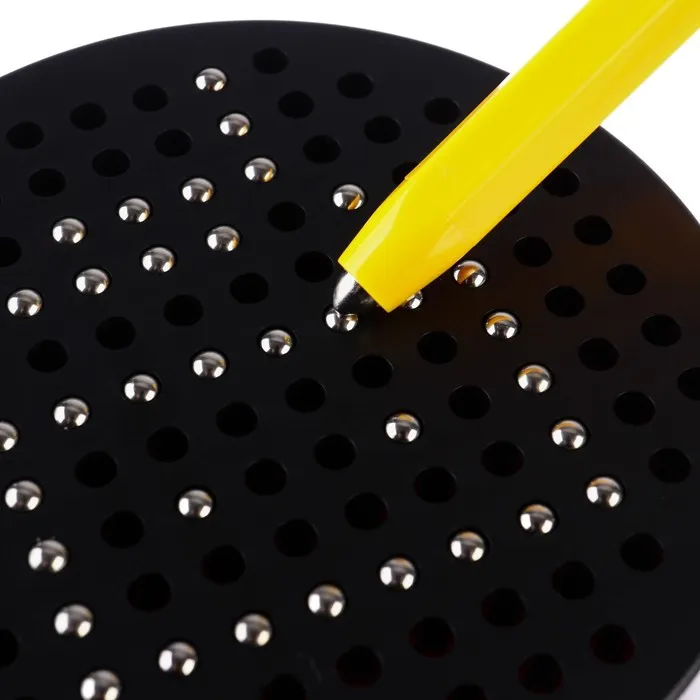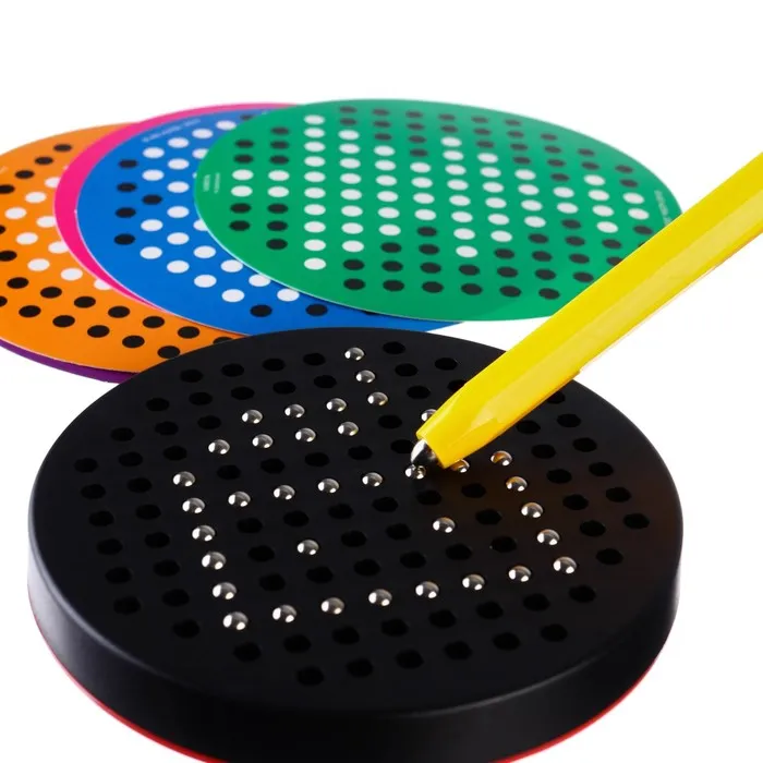 - Магнитные элементы легко перемещать по поверхности с 120 отверстиями. Ребёнок учится точно контролировать движения, что важно для подготовки к письму.