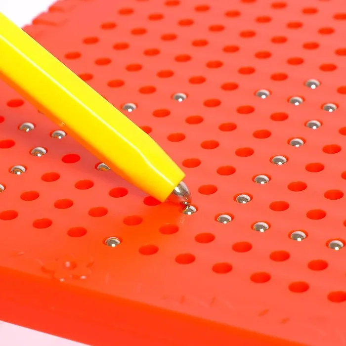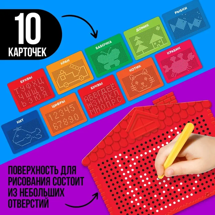 Планшет обучающий «Магнитное рисование» красного цвета с 375 отверстиями станет отличным инструментом для развития фантазии и координации у детей. Этот планшет в виде домика позволяет создавать разнообразные изображения с помощью магнитного стилуса и металлических шариков, превращая обучение в увлекательную игру.