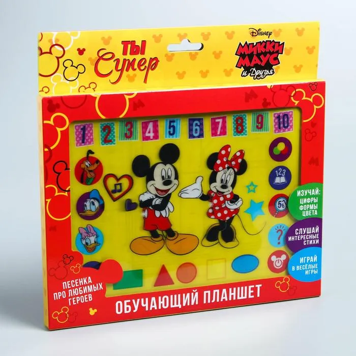Учимся с любимыми героями! Интерактивный планшет «Микки Маус и друзья» — это увлекательное устройство для первых шагов в обучении. С ним ребёнок освоит цифры, формы и цвета в игровой форме, а весёлые стихи и песенки сделают процесс интереснее.
