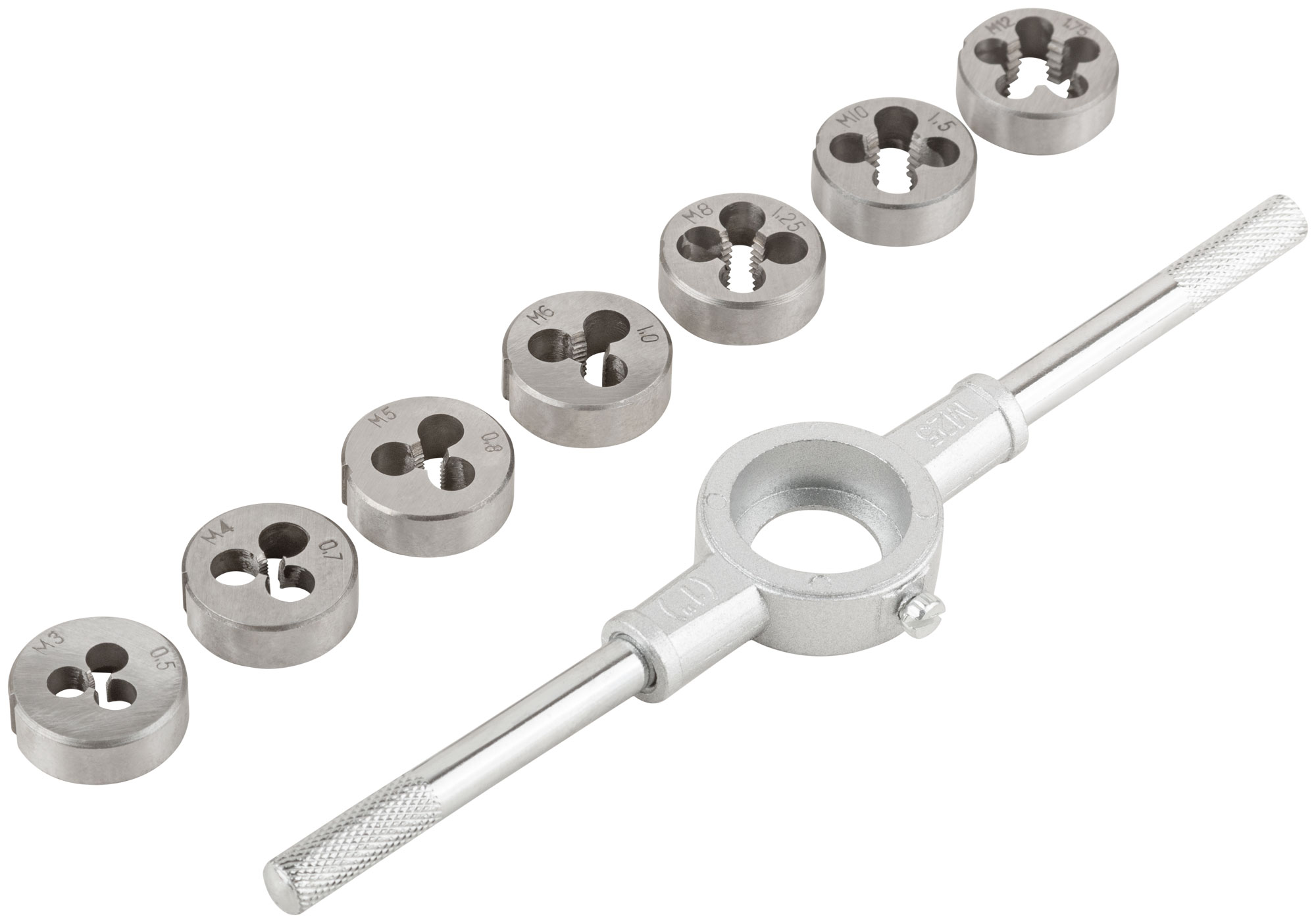 Плашки изготовлены из легированной инструментальной стали, что гарантирует высокую износостойкость и долговечность. Плашкодержатель выполнен из прочной инструментальной стали и цинкового сплава, обеспечивая надежную фиксацию и удобство в работе.