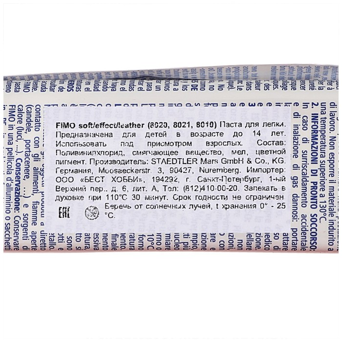 Полимерная глина FIMO подходит для начинающих мастеров и професиональных художников.ОсобенностиМасса мягкая, поэтому вы легко придадите ей нужную форму.Цвета можно смешивать для получения необходимых оттенков, которые сохранятся после обжига.После запекания изделия становятся прочными и долговечными.Упаковка легко открывается без использования ножа. Если вы не полностью израсходовали блок, то остатки можно завернуть в упаковку — так глина лучше сохранится.Термическая обработка. Готовое изделие поместите внутрь духовки на тарелке, стекле или фольге. Температура обжига не должна пpeвышaть 130 °С.Пластика рекомендована для детей старше 8 лет.