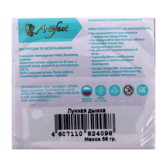 Artifact — первый в России производитель полимерной глины, который выпускает качественные и безопасные материалы для лепки и моделирования.Полимерная глина Artifact — это оптимальный вариант для того, чтобы познакомиться с материалом и сделать первый шедевр. Цвет не меняется после запекания. Легко смешивается с другими для получения ярких оттенков.По внешнему виду и своей податливости полимерная глина похожа на пластилин, а после запекания превращается в твёрдую пластмассу. С её помощью можно изготовить мельчайшие детали. Работать с полимерной глиной легко: изделие нужно только слепить и запечь.Обожжённые поделки хранятся длительное время. Готовые изделия можно мыть и протирать влажной салфеткой. Состав полимерной глины подобран таким образом, чтобы при хранении она не твердела, при лепке не крошилась и не пачкалась, а после запекания не ломалась. Материал безопасен, с ним может работать даже ребёнок.Подходит для профессионального использования. Рекомендовано для детей от 5 лет.